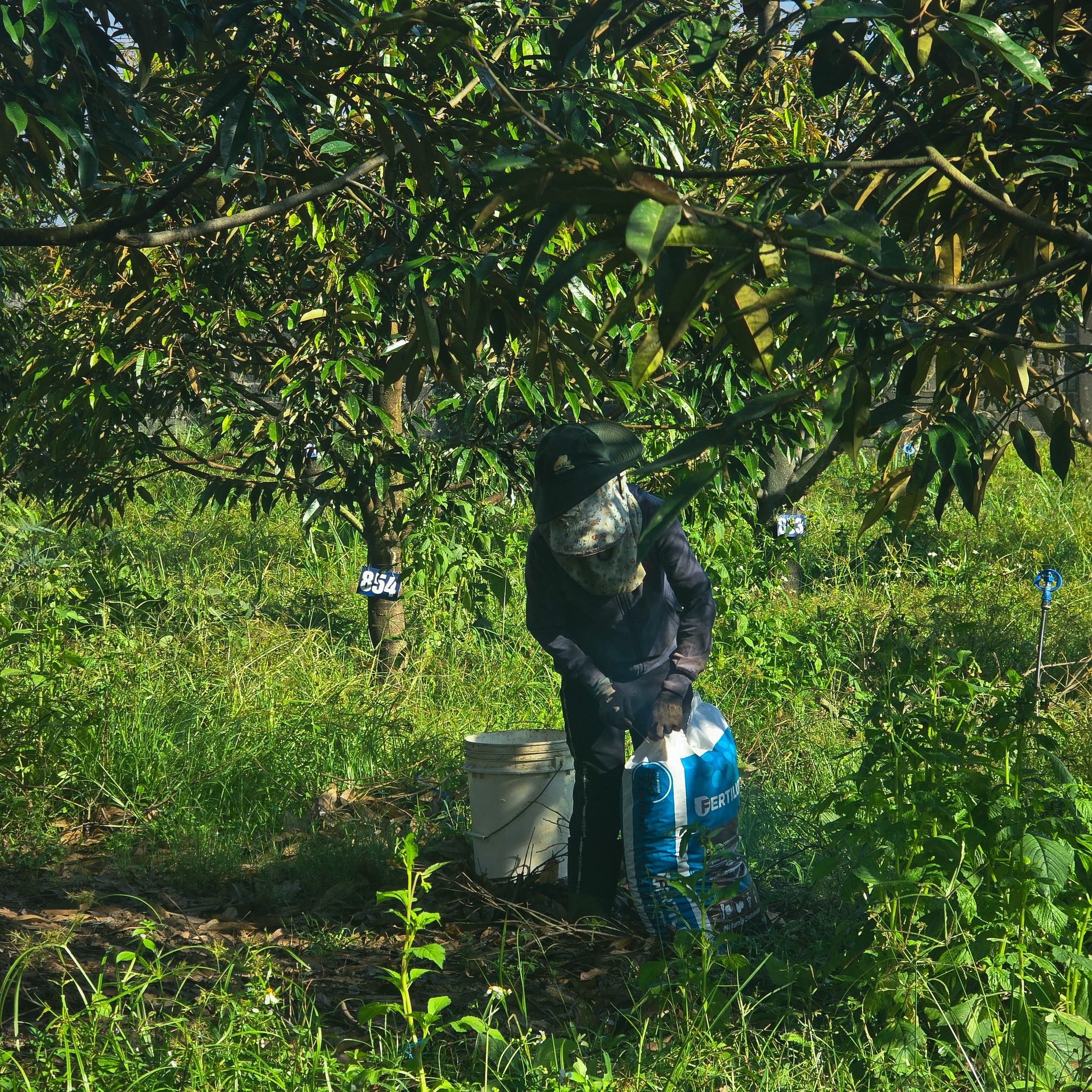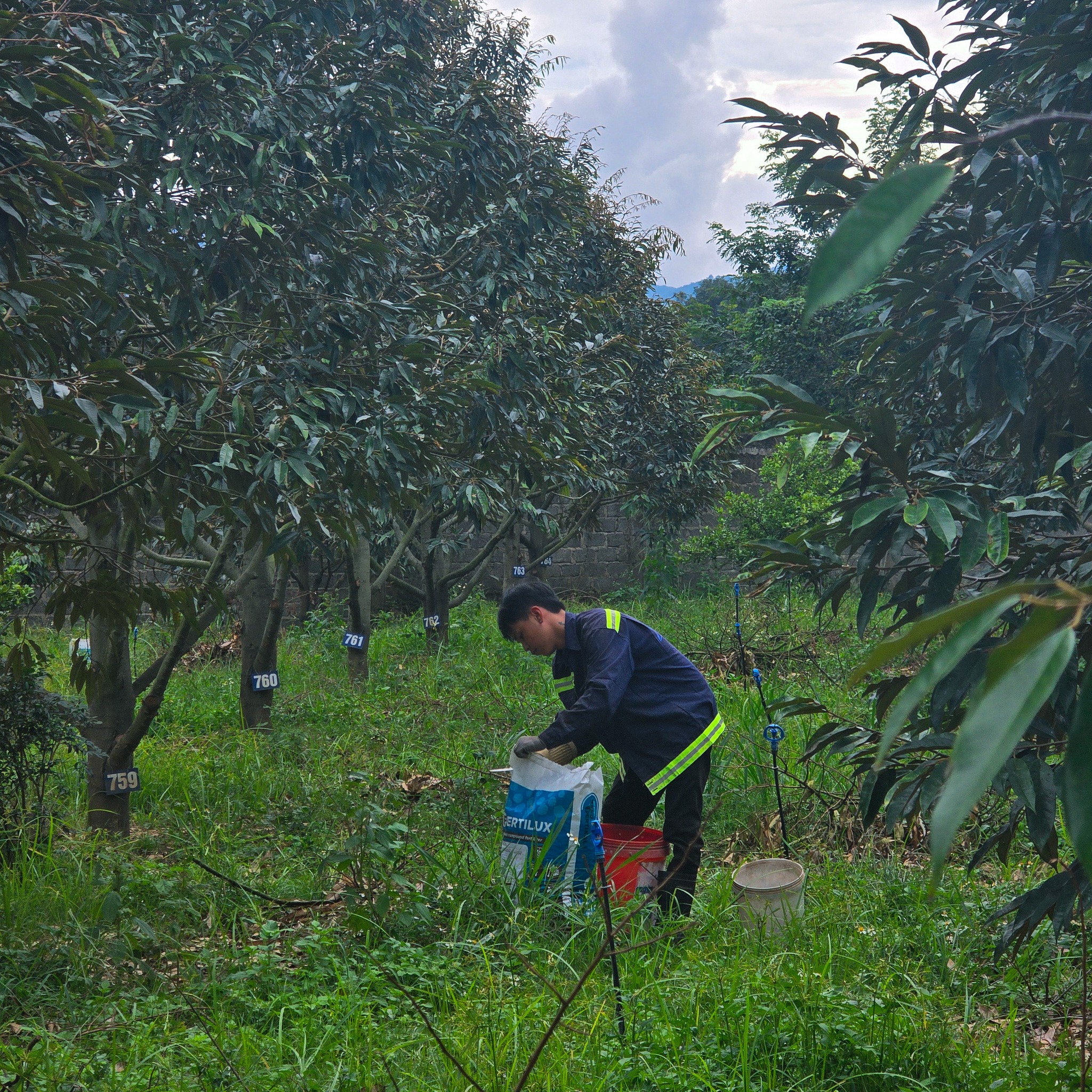 Sau những ngày tập trung cho việc cắt tỉa và vệ sinh, hôm nay đội ngũ kỹ thuật tại Duco Farmstay bắt đầu công đoạn quan trọng tiếp theo: cung cấp dinh dưỡng phục hồi cho vườn sầu riêng.